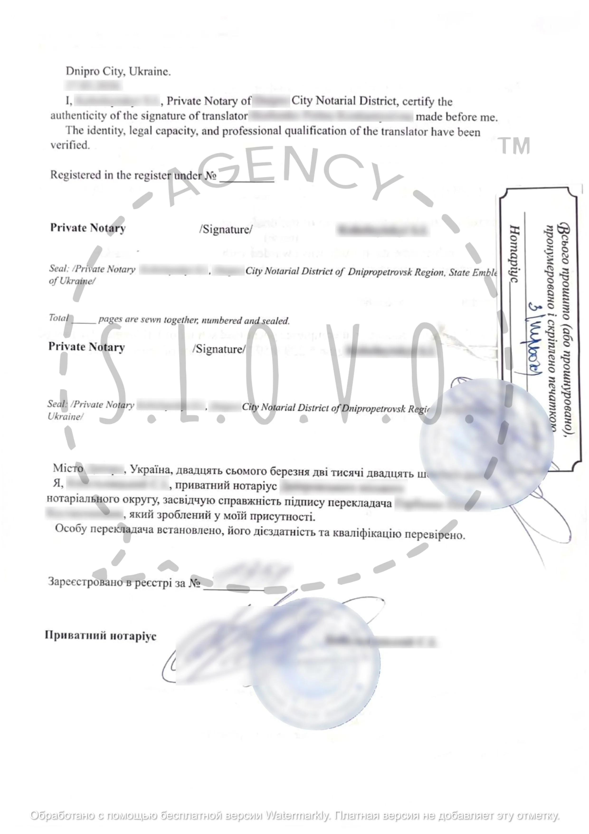 Бюро підтверджує відповідність перекладу оригіналу своєю офіційною печаткою та підписом перекладача. Цей формат часто підходить для закордонних університетів, приватних шкіл, роботодавців або банків.